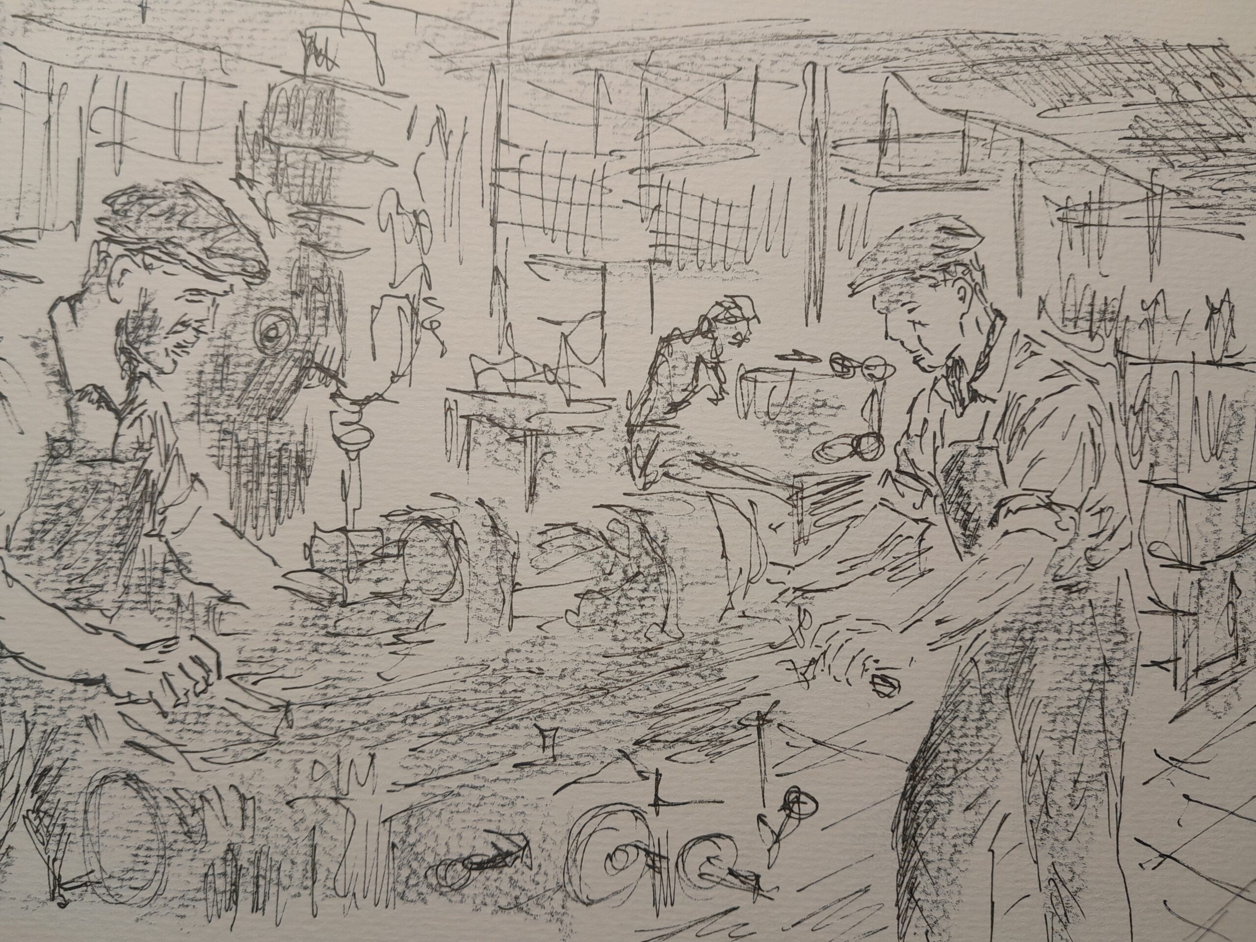 Die Zeichnung wirkt wie eine Momentaufnahme des Alltags, roh und direkt. Sie verzichtet auf dekorative Elemente und setzt stattdessen auf Beobachtung, Bewegung und soziale Nähe. Der Stil erinnert an Studienzeichnungen oder reportagehafte Skizzen, bei denen das Sehen und Festhalten des Augenblicks wichtiger ist als Ausarbeitung oder Perfektion.