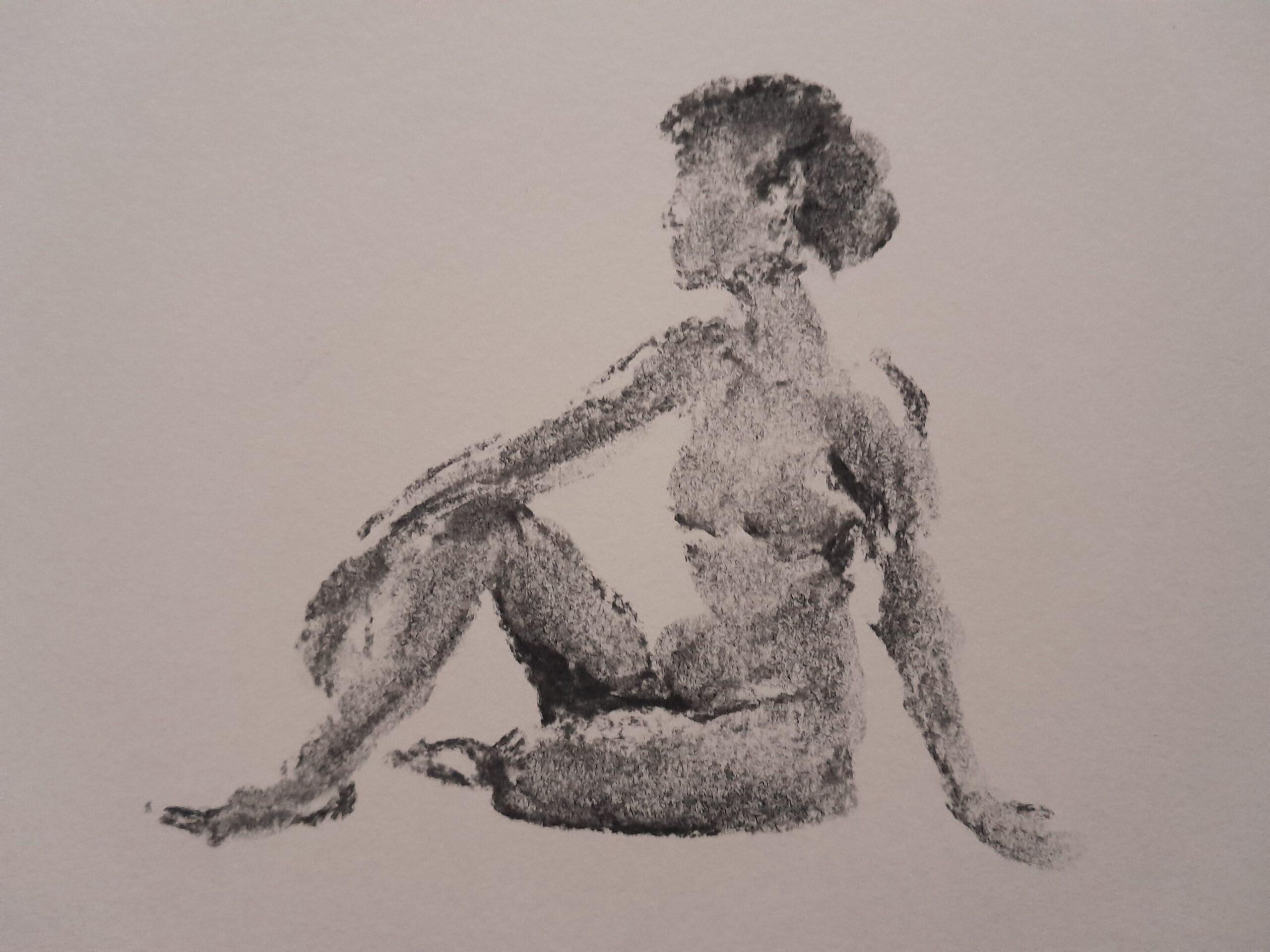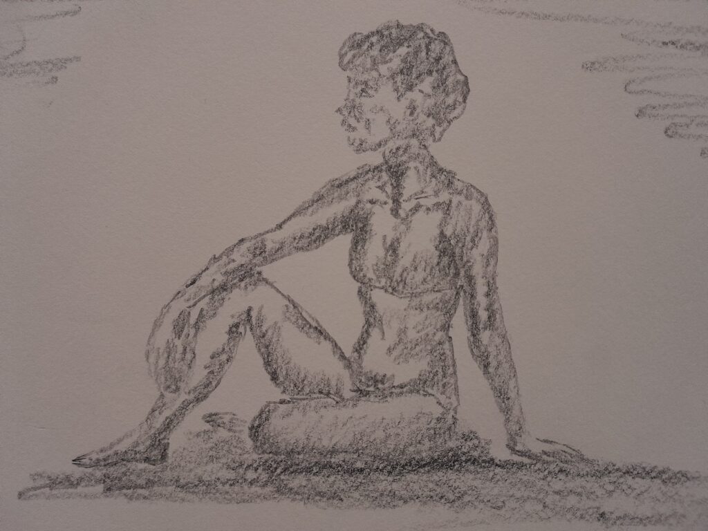 Die weibliche Figur sitzt am Boden, leicht diagonal zum Betrachter ausgerichtet. Ein Bein ist angewinkelt und nach vorne gezogen, das andere liegt seitlich ausgestreckt. Der Oberkörper ist aufrecht, jedoch nicht steif – die Haltung wirkt entspannt, nach innen gekehrt.